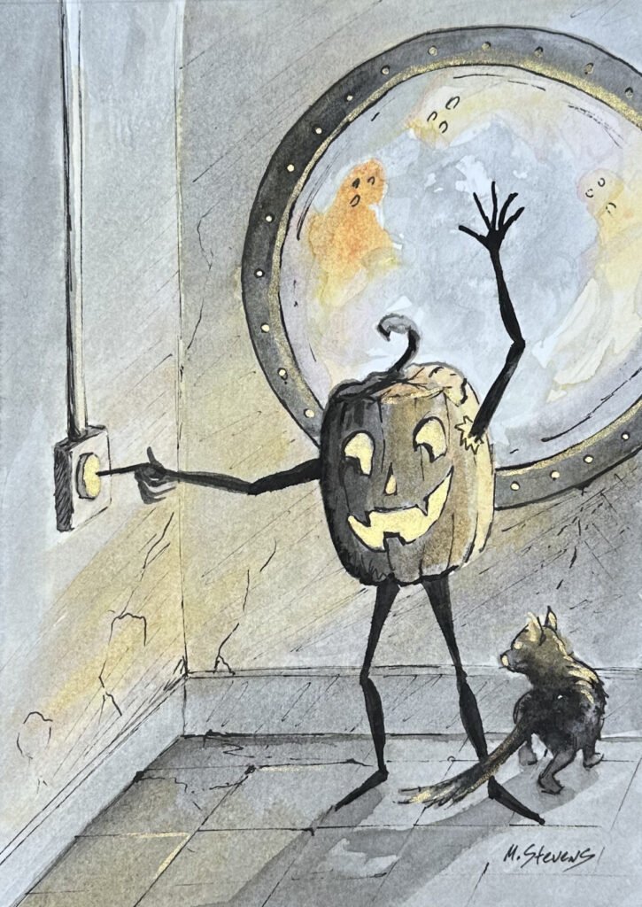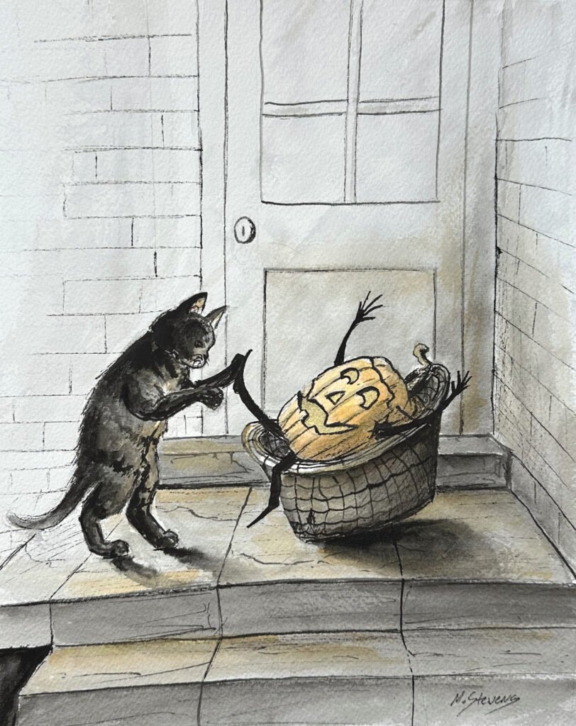 This little demon pumpkin was left on our doorstep, an orphan destined to befriend a curious kitten. This marks the beginning of the Pumpkin and Kitten series.