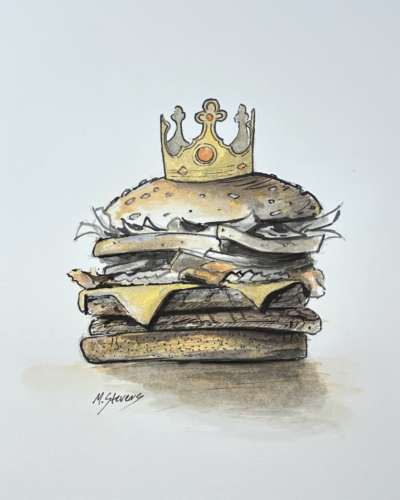 A whimsical crown rests atop a perfectly stacked burger, transforming an everyday meal into a regal delight.