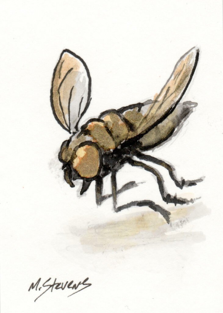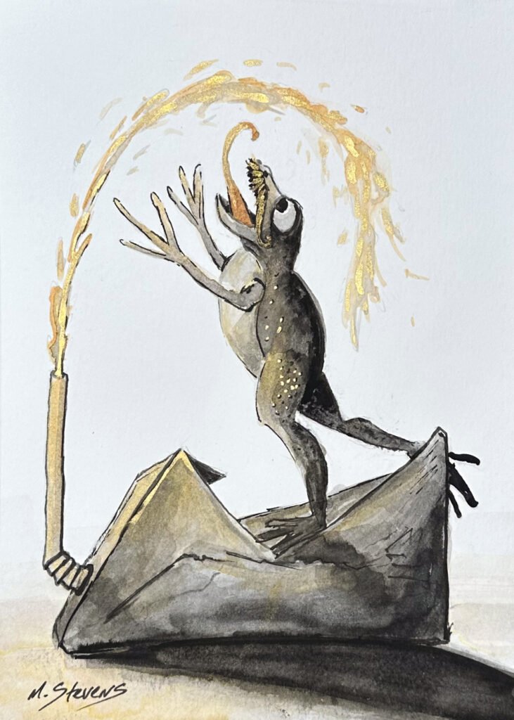 A fly flew too close to a campfire. An ember caught on its tail, lighting it up for a fleeting, magical glow before the night swallowed the light again. (Art on fire in video)