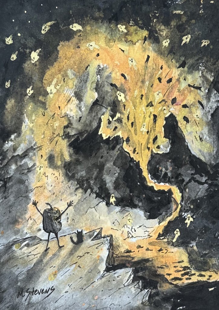 During their adventure at an exploding volcano, Pumpkin and Kitty watched in awe as a ghost burst from the fiery depths below, shooting skyward from the volcano’s molten mouth.