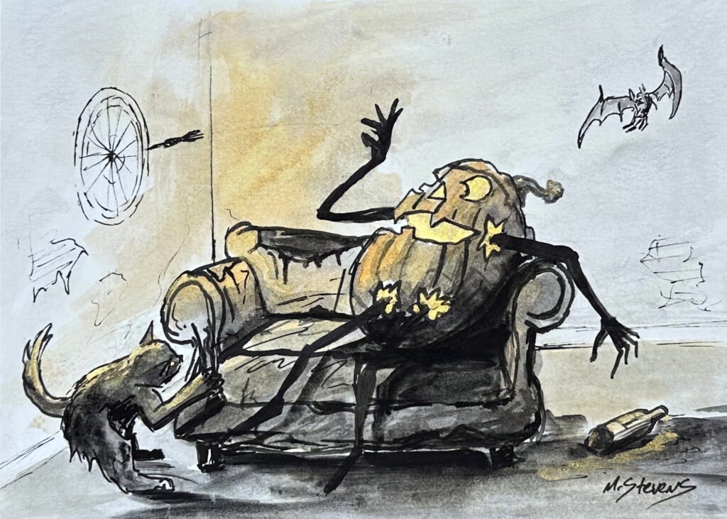 After a whole day of mischief and mayhem, Kitty and Pumpkin sneak down to the basement and curl up on the old, shredded couch. Exhausted, they plop down for some well-deserved R&R.