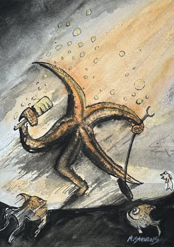 A starfish with dreams of rock stardom, performing on the reef for its devoted groupies: angelfish, crustaceans, and urchins cheering from the coral crowd.