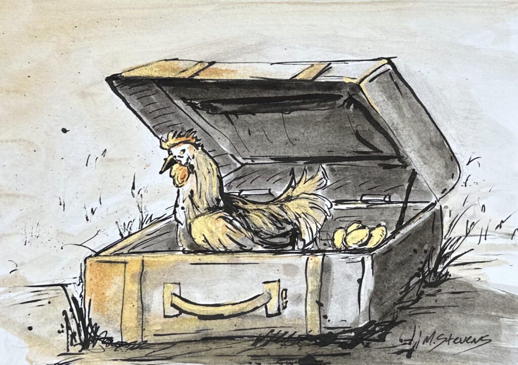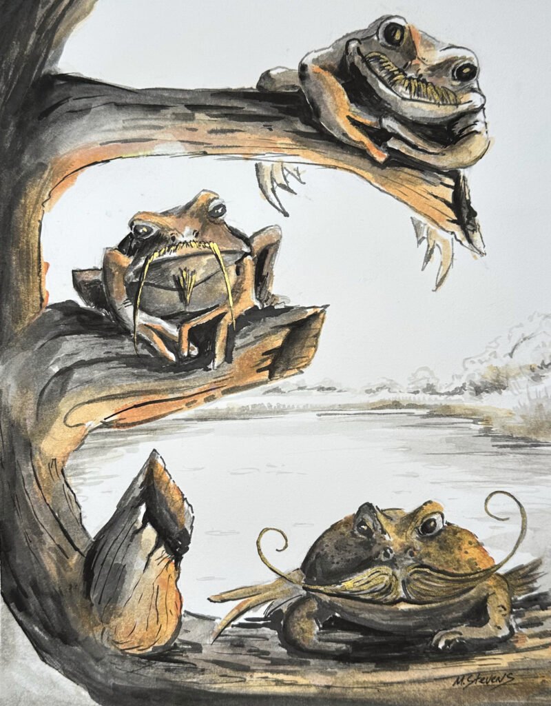 Three dapper, mustachioed frogs lounge on their log, keeping watch over the other creatures and discussing the great matters of the world, and what to have for lunch.