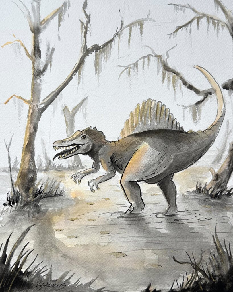 In the murky swamp, teeming with life and hidden in shadows, there’s more than enough food to satisfy a mighty Spinosaurus, from slippery fish to unsuspecting creatures lurking among the reeds.