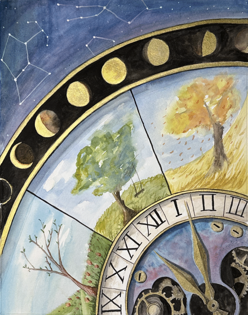 This painting explores how time reveals itself on different scales. A pocket watch marks the precise tick of a moment, while the shifting seasons show the cycles of daily life. The phases of the moon trace the months, and the constellations above chart the passing years. Together, these layers suggest that time is both measured